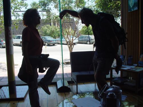 Boots on foot, hats and souvenirs on head,